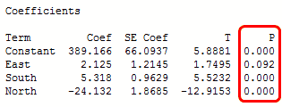 En la salida de más abajo, podemos ver que las variables predictor de Sur y Norte son significativas porque los p-valores de ambas son 0.000. sin embargo, el p-valor para Este (0.092) es mayor que el nivel alfa común de 0.05, que indica que no es estadísticamente significativo.