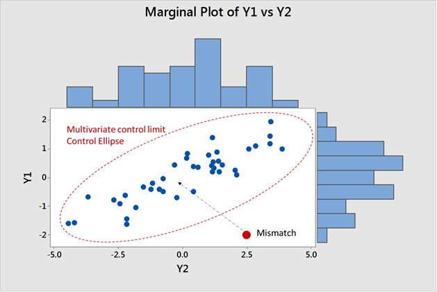 En el gráfico inferior, los valores de los parámetros Y1 y Y2 están correlados (altos valores de Y1 están asociados con altos valores para Y2) así que el punto rojo en la esquina inferior derecha parece estar fuera de control (fuera de la elipse de control) desde un punto de vista multivariable. Sin embargo, desde una perspectiva univariable, este punto rojo permanece dentro de los márgenes de fluctuación usuales tanto para Y1 como Y2. Este punto claramente representa un desajuste entre Y1 y Y2. La distancia cuadrática multivariable generalizada del punto rojo a la media de la nube de puntos es inusitadamente grande.