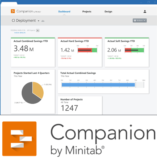 Companion by Minitab® es una extensa plataforma para ejecutar y crear informes sobre los proyectos de mejora de procesos. Incluye un conjunto de herramientas de escritorio integrados para completar proyectos y un panel basado en la web que instantáneamente actualizar todos los datos del proyecto.
