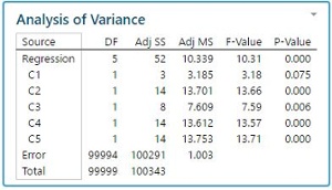 Para ilustrar esto, se simularon 6 columnas con 100000 observaciones cada una. Se introdujo un modelo para que las 5 coumnas de entrada tuvieran un pequeño efecto en la última columna (impacto real pero muy pequeño). El R cuadrado es, comprensiblmente, extremadamente pobre (cerca del 0%), pero los P- valores indican que los efectos son muy significativos desde una perspectiva estadística (ver los resultados a continuación).