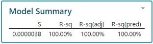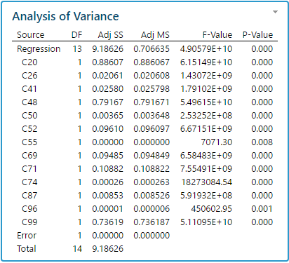 Para ilustrar esto, hemos simulado aleatoriamente 100 columnas, normalmente distribuidas, con 15 observaciones cada una. Una regresión por pasos muestra que no menos de 13 columnas de 99 variables tienen un efecto estadísticamente significativo en la última columna (valores P muy cercanos a 0) y el valore del cuadrado de R es extremadamente alto (100%). Obviamente todos estos son efectos espurios causados exclusivamente por fluctuaciones aleatorias (ver los resultados a continuación).
