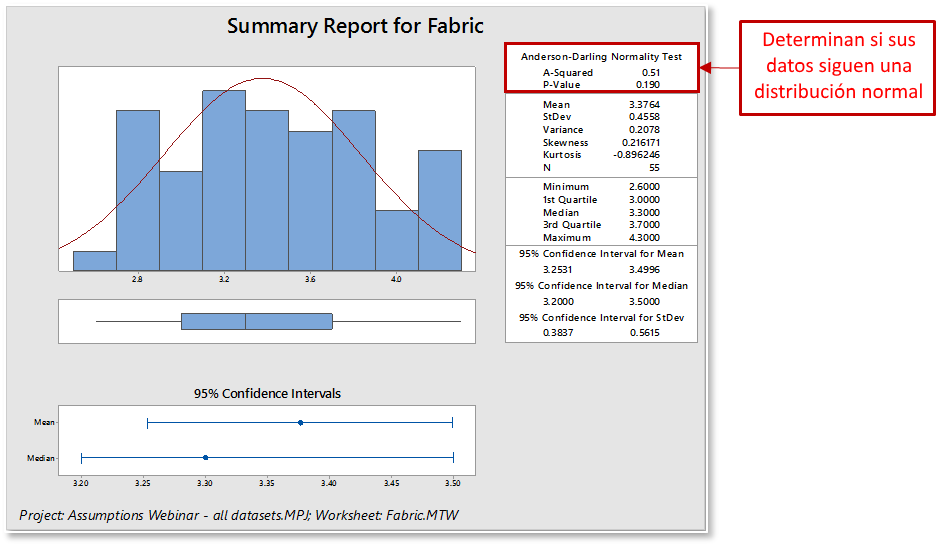 Las estadísticas descriptivas de Minitab con el resumen gráfico generarán una buena visualización de sus datos y calcularán el valor de Anderson-Darling & p-valor. El resumen gráfico muestra cuatro gráficos: histograma de datos con una curva normal superpuesta, diagrama de caja e intervalos de confianza del 95% para la media y la mediana.
