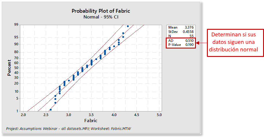 Antes de realizar una prueba estadística, debe averiguarse la distribución de los datos. Si no se hace, hay riesgo de seleccionar una prueba estadística inadecuada. Muchos métodos estadísticos comienzan con el supuesto de que los datos siguen la distribución normal, incluidas las pruebas t de 1 y 2 muestras, la capacidad del proceso, I-MR y ANOVA. Si no se tienen datos distribuidos normalmente, podrá usarse una prueba no paramétrica equivalente basada en la mediana en lugar de la media, o probar la Transformación de Box-Cox o Johnson para transformar los datos no normales en una distribución normal.