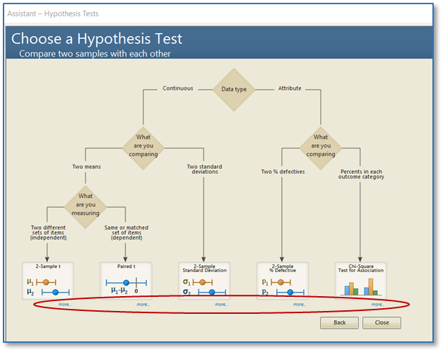 Minitab ofrece varios métodos para probar la igualdad de varianzas. Se puede consultar la Ayuda de Minitab para decidir qué método usar de acuerdo con el tipo de datos que se tienen. También es posible utilizar el Asistente de Minitab para verificar esta suposición. (Consejo: cuando se use el Asistente, haciendo clic en "más" se pueden ver consejos de recopilación de datos e información importante sobre cómo Minitab calcula los resultados).