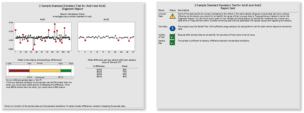 Después de realizar el análisis, verifique el Informe de diagnóstico para la interpretación de la prueba y la Tarjeta de informe para las alertas de puntos de datos inusuales o suposiciones que no se cumplieron. (Consejo: Al realizar la prueba t de 2 muestras y ANOVA, el Asistente adopta un enfoque más conservador y utiliza cálculos que no dependen de la suposición de la misma varianza).