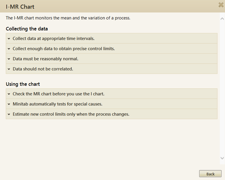 Se puede utilizar alguno de los diversos tipos de gráficos de control disponibles en Minitab Statistical Software para evaluar la estabilidad del conjunto de datos. El menú Asistente puede guiar a través de las opciones para seleccionar el gráfico de control apropiado en función de los datos y el tamaño del subgrupo. Se pueden obtener consejos sobre la recopilación y el uso de datos haciendo clic en el enlace "más".