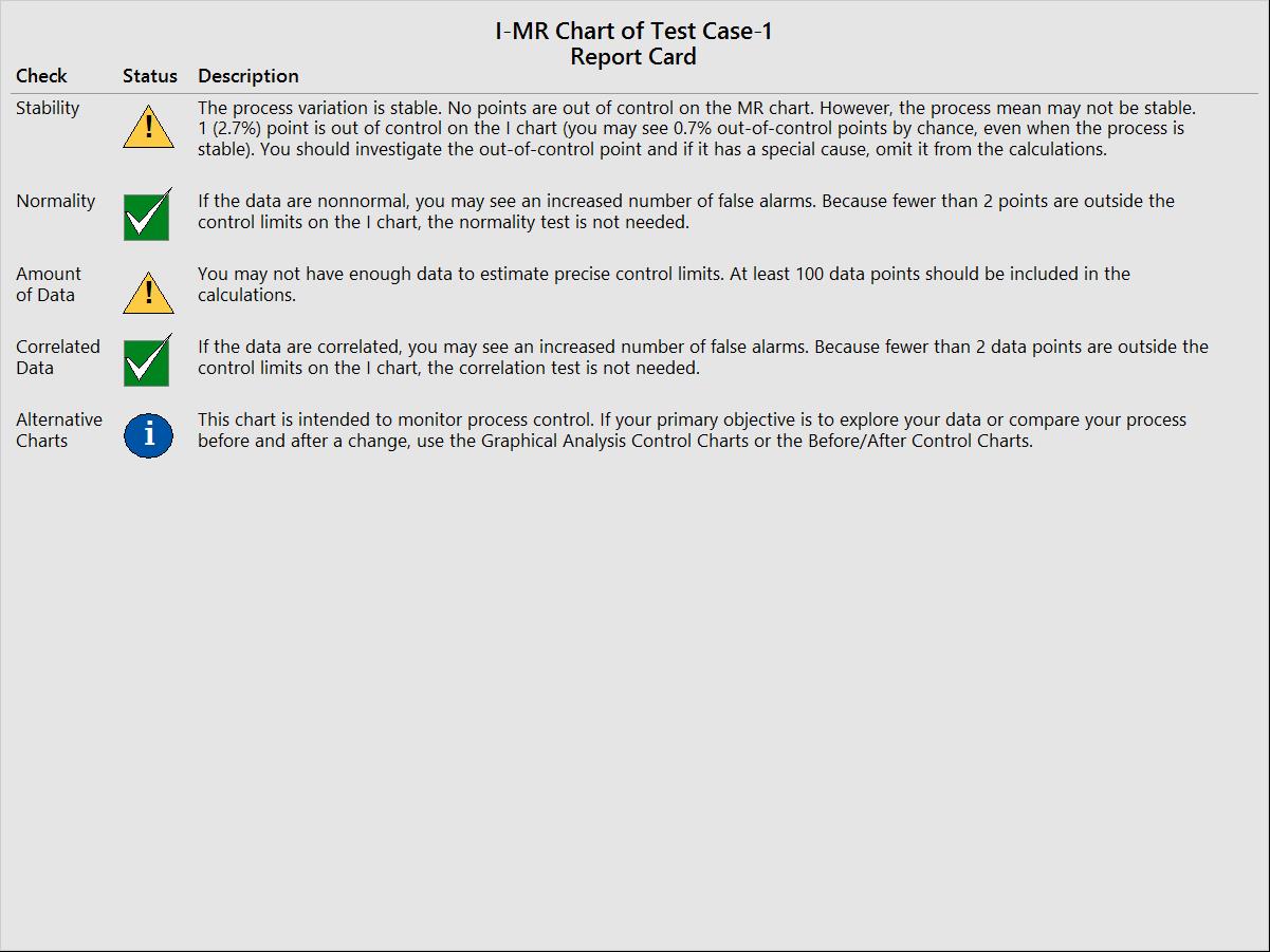 Además de preparar el gráfico de control, Minitab prueba los patrones fuera de control o no aleatorios basados en las Reglas de Nelson y proporciona una evaluación en los informes de fácil lectura de Resumen y Estabilidad. La tarjeta de informe (Report Card), según el gráfico de control seleccionado, verificará automáticamente sus suposiciones de estabilidad, normalidad, cantidad de datos, correlación y sugerirá cuadros alternativos para analizar más a fondo sus datos.