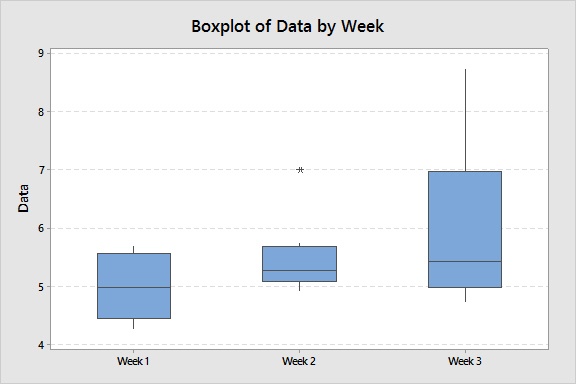 También conocido como diagrama de caja y bigote, el diagrama de caja muestra cómo se distribuye una variable numérica y continua, incluida su forma y variabilidad. Se puede crear un único diagrama de caja para un solo conjunto de datos, o múltiples diagramas de caja para comparar múltiples conjuntos de datos. Los diagramas de caja también ayudan a identificar valores atípicos. Ubicación de Minitab: Gráfica > Gráfico de caja |