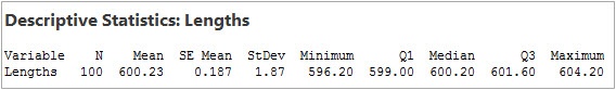 Esta es la primera herramienta no gráfica en esta publicación. Esta herramienta proporciona un resumen de los datos y puede incluir estadísticas tales como la media, la mediana, el modo, el mínimo, el máximo, la desviación estándar, el rango, etc. Ubicación de Minitab: Estadísticas > Estadísticas básicas > Mostrar estadísticos descriptivos |
