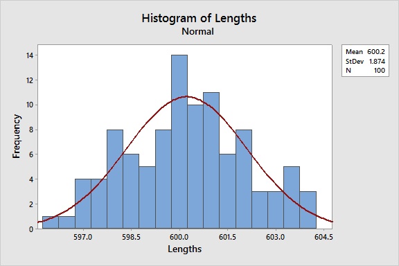 Al igual que los diagramas de caja, los histogramas revelan la forma y la extensión de un conjunto de datos, y pueden ayudar a evaluar si los datos siguen una distribución normal, son sesgados a la izquierda, sesgados a la derecha, unimodales, etc. Los histogramas dividen los datos en intervalos de un rango determinado trazados a lo largo del eje x horizontal, y muestran el número de puntos de datos dentro de cada intervalo en el eje vertical y. Ubicación de Minitab: Gráfica > Histograma |