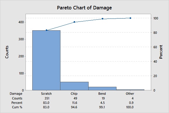 Un gráfico de Pareto es una herramienta de calidad, básica, que se utiliza para resaltar los defectos más frecuentes o las causas más comunes de un defecto. Este tipo especializado de gráfico de barras lleva el nombre de Vilfredo Pareto y su regla 80-20 . Al ordenar las barras de mayor a menor, un gráfico de Pareto puede ayudar a separar los "pocos vitales" de los "muchos triviales". Estos gráficos revelan dónde se pueden obtener las mayores ganancias. Ubicación de Minitab: Estadísticas > Herramientas de calidad > Gráfico de Pareto |