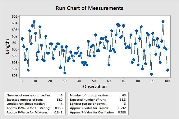 Los gráficos de ejecución representan sus datos a lo largo del tiempo, suponiendo que se recopilaron y registraron en orden cronológico. Este tipo especial de gráfico de series de tiempo se puede usar para determinar si existen patrones y comportamientos no aleatorios en su proceso, como tendencias, oscilaciones, mezclas y agrupación. Ubicación de Minitab: Estadísticas > Herramientas de calidad > Gráfica de corridas |