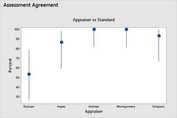 Como los Estudios del sistema de medición R&R y los estudios de linealidad y sesgo del sistema de medición mencionados anteriormente para las medidas continuas, esta herramienta ayuda a evaluar si puedo fiarse de las medidas categóricas, como las calificaciones aprobación/fallo. Esta herramienta está disponible para tipos de datos binarios, ordinales y nominales. Ubicación de Minitab: Estadísticas > Herramientas de calidad > Análisis de concordancia de atributos O Asistente > Análisis de sistemas de medición . |