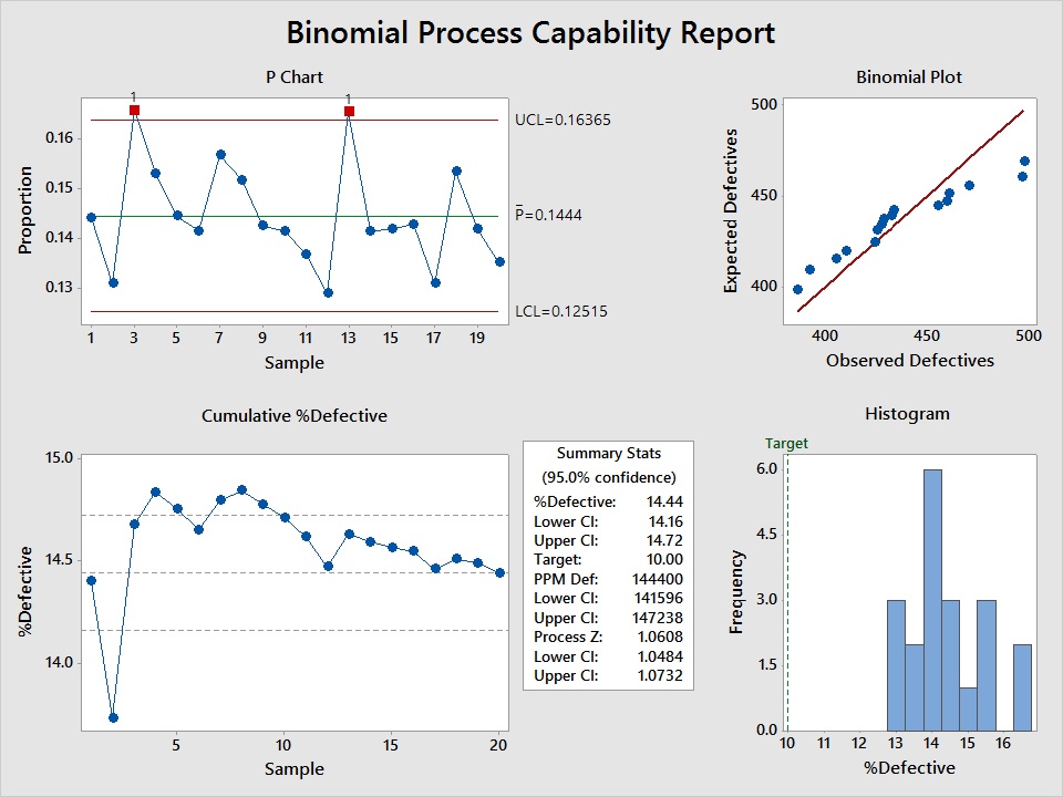 Si se está contando el número de elementos defectuosos, donde cada elemento se clasifica como aprobado/no_aprobado, avance/inactivo, etc., y desea calcular las partes por millón (PPM) defectuosas, entonces se puede utilizar el análisis de capacidad binomial para calcular el estado actual del proceso.