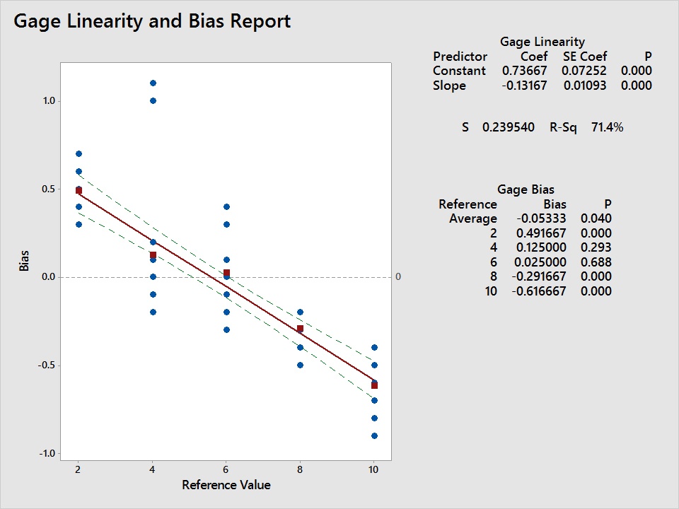 Ubicación de Minitab: Estadísticas > Herramientas de calidad > Estudio del sistema de medición > Estudio de linealidad y sesgo del sistema de medición.