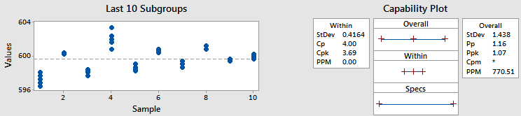 Como muestra el gráfico de la izquierda no hay muchos cambios y desviaciones entre los subgrupos en comparación con la variación dentro de los propios subgrupos. Por lo tanto, las desviaciones estándar dentro y total son similares, lo que significa que Cpk y Ppk son similares, también (a 1.13 y 1.07, respectivamente).