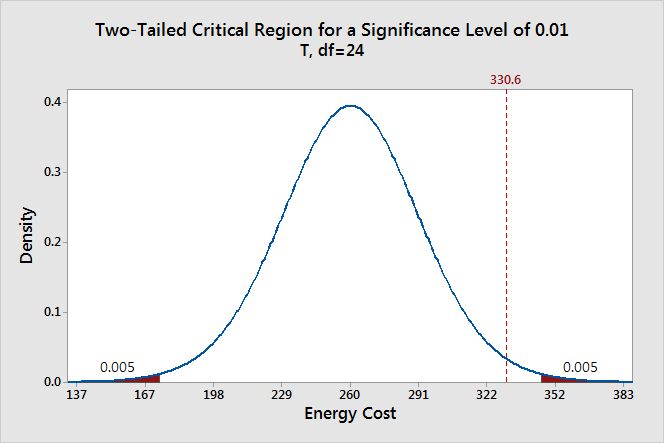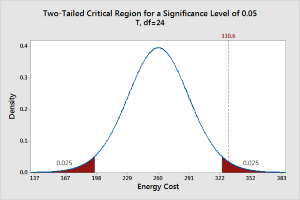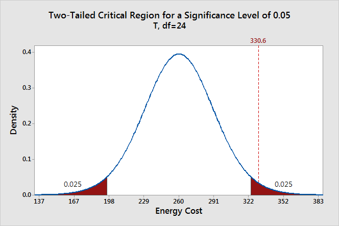 Para graficar el P valor para el conjunto de datos de ejemplo, es necesario determinar la distancia entre la media de la muestra y el valor de la hipótesis nula (330.6 - 260 = 70.6). A continuación se puede graficar la probabilidad de obtener una media muestral que seal al menos tan extrema en ambas colas de la distribución (260 +/- 70.6).