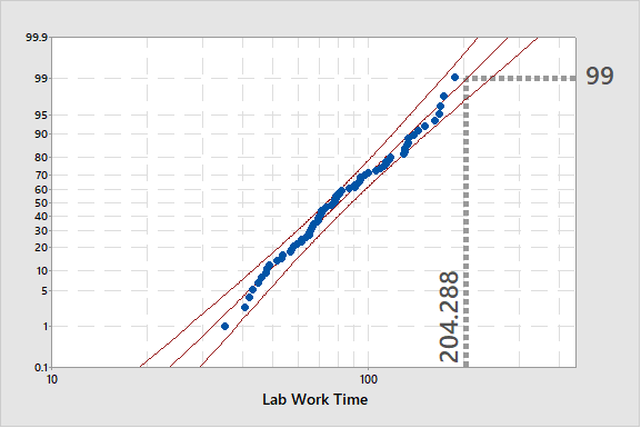 El valor X correspondiente a Y = 99 en el gráfico de probabilidad fue de 204 minutos. En otras palabras, el 99% de todo el trabajo previo al laboratorio debe completarse en 204 minutos.