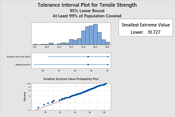Al igual que los datos del hospital, estos datos no eran normales. Debido a que un intervalo de tolerancia estima lo que está pasando en las colas de la distribución, no la media, el supuesto de distribución es importante. Aquí, una distribución de valor extremo proporcionó un buen ajuste de distribución. Debido a que el tubo no podía ser demasiado fuerte, era apropiado un límite de tolerancia de un lado, un límite inferior. El valor del límite de tolerancia inferior del 99% con una confianza del 95% fue de 10.7 libras. En otras palabras, podríamos estar seguros al 95% de que el 99% de la población de tubos tiene una resistencia a la tracción de al menos 10,7 libras, muy por encima del límite de especificación de 3 libras.