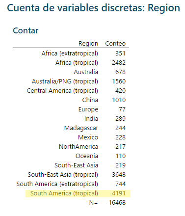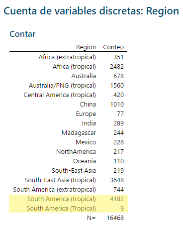Pero resulta que hay un pequeño error en la columna Region (al menos en el momento de escribir este artículo). Es probable que apenas lo haya notado, pero hay una discrepancia entre mayúsculas y minúsculas. A un total de 4182 filas se les asigna la región de América del Sur (tropical), mientras que a 9 filas del conjunto de datos se les asigna la región de América del Sur (Tropical). Este es el tipo de desajuste que puede causar problemas en su análisis. Si sospecha que existe tal error, o simplemente quiere verificar que no existe, sería una tarea tediosa analizar 4191 filas de datos en busca de desajustes.