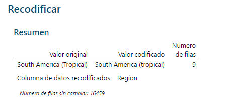 - En la tabla que aparece, desplácese hacia abajo para encontrar la discrepancia entre mayúsculas y minúsculas. Luego, en la columna Valor recodificado, cambie South America (Tropical) para que use una t minúscula.