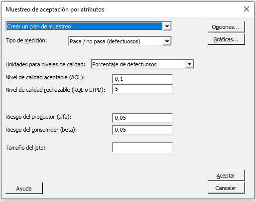 Estos dos planes de muestreo son realmente solo planes de muestreo de aceptación C=0 con un tamaño de lote infinito. Los mismo tamaños de muestra pueden generarse utilizando Estadísticas > Herramientas de calidad > Muestreo de aceptación por atributos por: