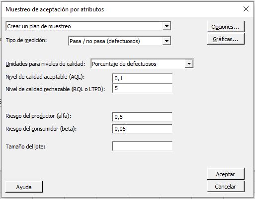 - Poniendo el Riesgo del productor (α) a un valor arbitrario alto, como 0,5 (nótese que α debe ser menor que 1-β para que funcione).