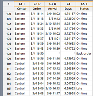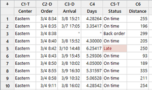 2. Fecha/hora, numérico y texto: Conozca sus tipos de datos de un vistazo¿Sabía que Minitab reconoce tres tipos diferentes de datos? Minitab es capaz de leer el primer valor que se entra en una columna y automáticamente etiquetar la parte superior de esa columna de acuerdo con el tipo de datos, para que pueda conocer su tipo de datos de un vistazo. Los tres tipos de datos son: