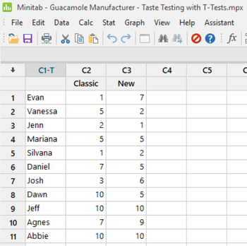 El fabricante de guacamole reune a gente para su prueba de sabor, hace que clasifiquen a los dos guacamoes y empieza a recopilar datos, pero sin ningún antecedente estadístico, ¡recurren a Miniteab para obtener ayuda con sus test-T!