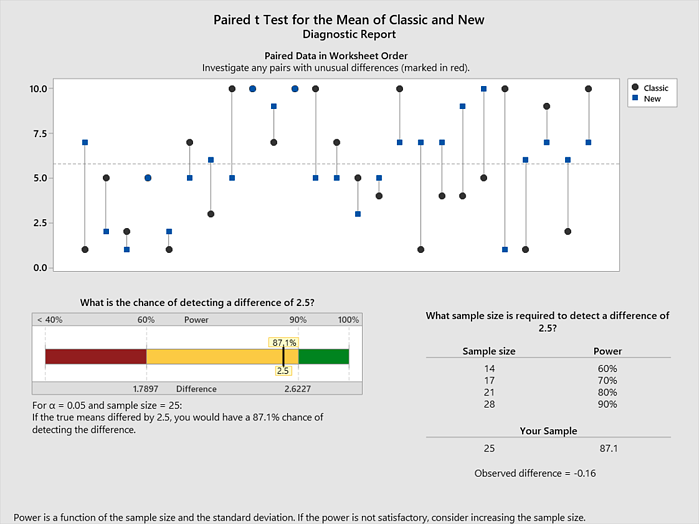 Dado el tamaño de mi muestra, tenía un 87% de probabilidad de detectar la diferencia, tal y como se muestra abajo. Esto me indica que mi prueba no era débil, significando que tenía la potencia adecuada para detectar una diferencia entre las recetas.