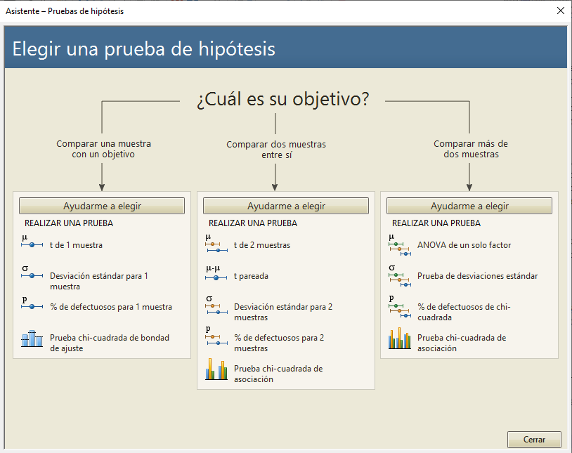 Cuando se hace clic en la Prueba de Hipótesis se abre una nueva ventana que presentará un mapa preguntando qué se desea hacer. En nuestro ejemplo de prueba, queremos comparar las dos muestras entre sí.