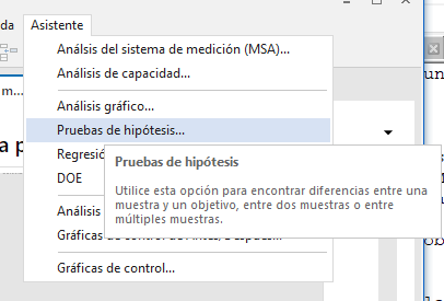 Los datos eran fáciles de entrar, como se puede ver arriba a la izquierda. Para analizar estos datos, el Asistente de Minitab puede guiar y ayudar con el análisis y el informe de resultados. Pasando por encima del menú de Pruebas de Hipótesis, mostrado arriba a la derecha, el Asistente explica alguna de las opciones.