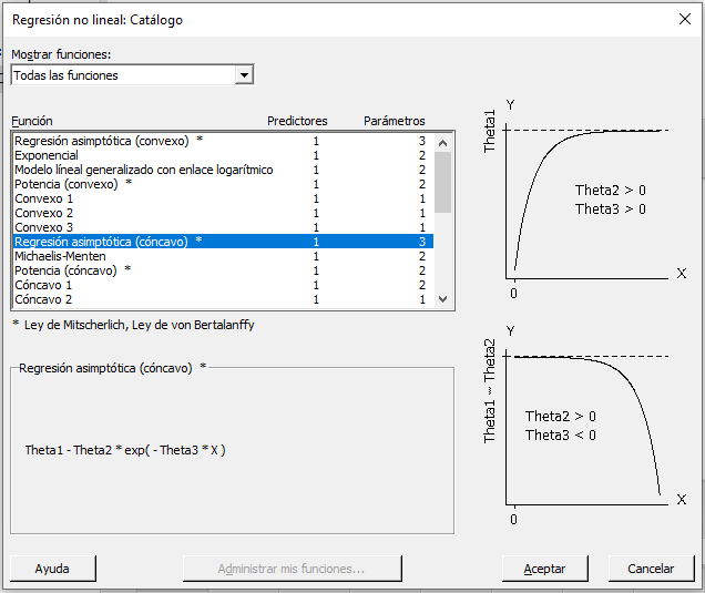 Sabemos que nuestros datos se aproximan a una asíntota, así que podemos seleccionar en las dos funciones de Regresión Asintótica. La versión cóncava se ajusta más a nuestros datos. Seleccionamos esta función y hacemos clic en Aceptar.