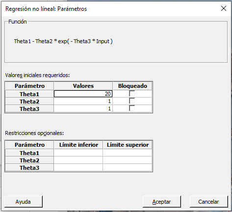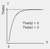 Nótese que Theta1 es la asíntota, o el techo, al que nuestros datos se aproximan. A la vista del primer gráfico de dispersión, eso ocurre aproximadamente en 20 para nuestros datos. Par un caso como el nuestro, donde la respuesta se aproxima a un techo cuando el predictor crece, Theta2 > 0 y Theta3 > 0.