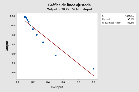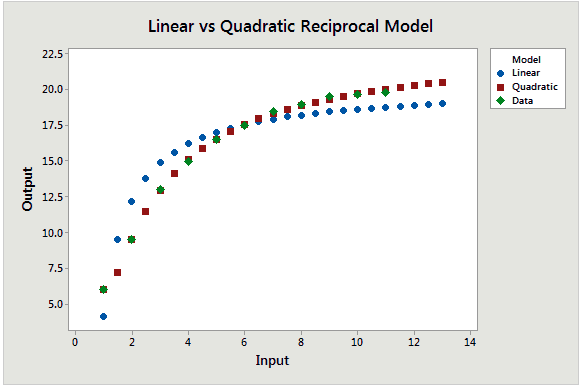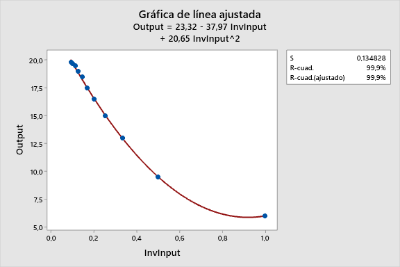 Para este ejemplo en particular, el modelo recíproco cuadrático se ajusta a los datos mucho mejor. El gráfico de línea ajustada cambia el eje X a 1/Input, por lo que es difícil de ver la curvatura natural de los datos.