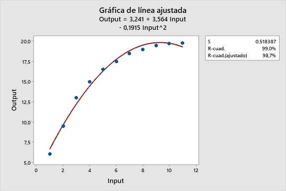 El gráfico de los datos parece tener una curva, por lo que intentaremos ajustar un modelo lineal cuadrático utilizando Estadística > Regresión > Gráfica de línea ajustada