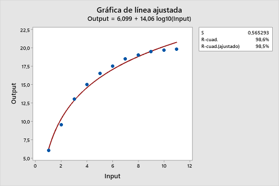 El gráfico de línea ajustada de Minitab dispone convenientemente de la opción para transformar logarítmicamente uno o ambos lados del modelo. Así que se ha transformado solo la variable predictora en el gráfico de línea ajustada inferior.