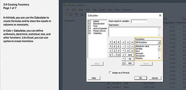 Puede usar la Calculadora en Minitab (Calc > Calculadora...) para crear fórmulas y almacenar los resultados en columnas o constantes. Con la herramienta Calculadora, puede definir fecha/hora, aritmética, estadística, texto y otras funciones. Cuando abra el cuadro de diálogo Calculadora, verá las funciones que están disponibles en Minitab. La sintaxis que necesita usar se mostrará en el cuadro de diálogo cuando elija una función. Al seleccionar la opción Asignar como fórmula, se permitirán actualizaciones automáticas de las celdas calculadas.