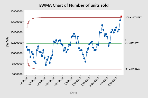 Ya se utilicen cuadros de control simples, como el cuadro de individuos, o cuadros avanzados, como el EWMA (como se muestra a continuación), ambos ayudarán a monitorizar el proceso en el software estadístico de Minitab y evitar el efecto látigo en el futuro.
