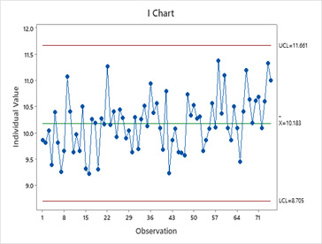 Un gráfico de control de Individuos para los datos muestra el proceso en control. Sin embargo, parece haber un pequeño cambio en el proceso en torno a la observación 66.