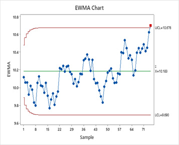 Para los mismos datos de proceso, el gráfico de control de EWMA marca el último punto de datos como fuera de control.