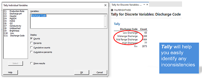 Utilizando Estadísticas > Tablas > Cuenta de variables individuales se puede ver una lista de los valores únicos y los conteos correspondientes en el panel de salida de Minitab. También se puede optar por almacenar los resultados en la hoja de trabajo de Minitab, que es extremadamente útil si se planea recodificar más de 100 valores únicos usando una Tabla de conversión.