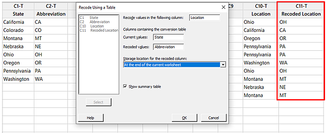 El menú Datos > Recodificar de Minitab puede ser útil para recodificar valores para corregir errores tipográficos o recodificar datos numéricos a texto o viceversa. Cuando es necesario volver a codificar más de 100 valores únicos, una tabla de conversión puede ayudar.