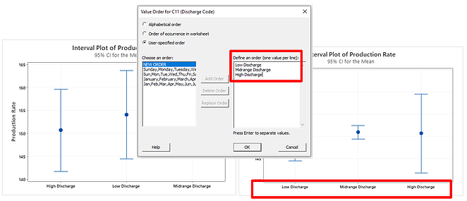 Haciendo clic con el botón derecho en la columna con los datos de texto y luego eligiendo Propiedades de columna > Orden de valores se elige el orden de una columna de texto. Minitab usa el orden alfabético como predeterminado; sin embargo, se puede actualizar el orden de una forma lógica para su análisis.