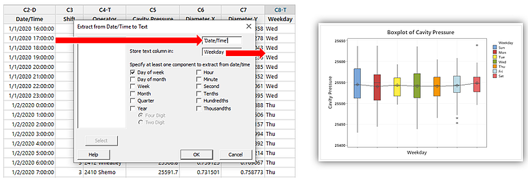 El uso de Datos > Fecha/Hora> Extraer a texto... crea una nueva columna que muestra el día de la semana. Esto ofrece una forma conveniente de crear una columna de agrupación para un análisis más detallado, por ejemplo, visualizar las diferencias entre los diferentes días de la semana.