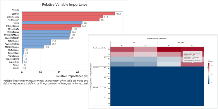 Se utiliza CART® (Classification & Regression Trees) en Minitab para construir un modelo que prediga la probabilidad de pérdida de clientes. El mapa de calor inferior muestra la probabilidad de pérdida predicha por el modelo y se basa en cinco de los importantes predictores identificados por el gráfico de Importancia de Variables Relativa de CART. Basándose en el gradiente de color, las sombras más oscuras de rojo representan clientes con el más alto riesgo de abandono, mientras que los clientes que son menos probables de perder se representan en azul.