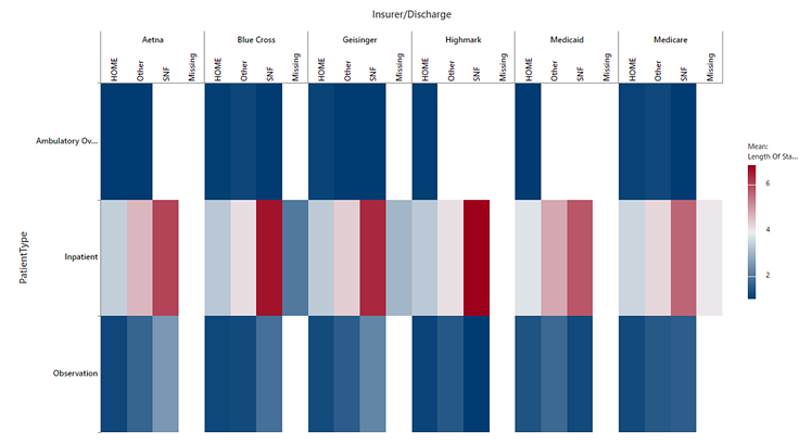 En sanidad, puede utilizarse un mapa de calor para visualizar el tiempo de estancia del paciente basándose en el tipo de paciente y la demografía. En este mapa de calor vemos que los pacientes con un código de descarga de Centro de Enferemería Especializada (en inglés SNF o Skilled Nursing Facility) que son representados en rojo oscuro tienen un tiempo de estancia medio más alto en comparación con otros grupos de pacientes.