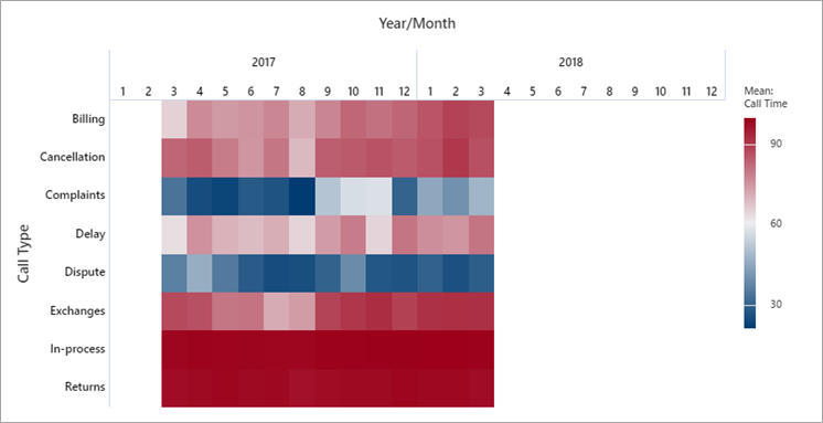 Un mapa de calor ofrece una forma adecuada para visualizar datos ordenados por tiempo para una agrupación por categorías. En este ejemplo, vemos tiempos de llamada por tipos de llamada para cada mes en 2017 y parte de 2018.