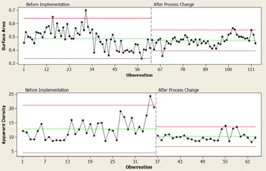 Los gráficos de control de Minitab demuestran el drástico efecto de implementar las condiciones del proceso óptimas determinadas por el experimento.