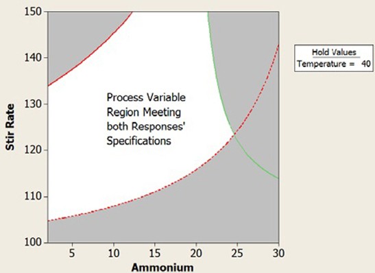 La funcionalidad de modelado DOE de Minitab proporcionó un gráfico de contornos superpuesto que se utilizó para encontrar las condiciones del proceso óptimas necesarias para cumplir las especificaciones de ambas respuestas.